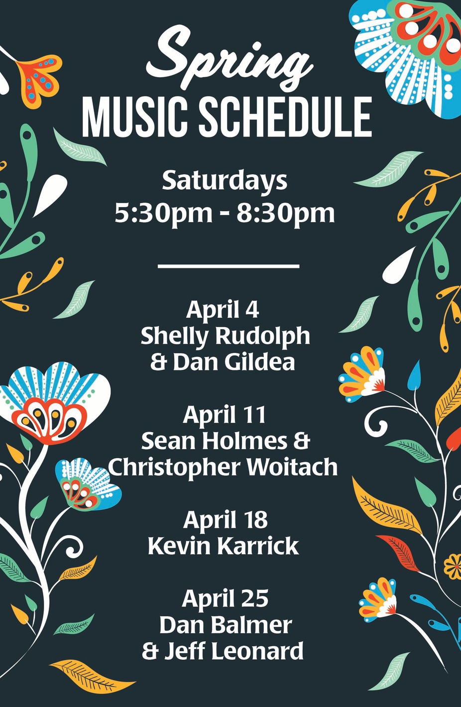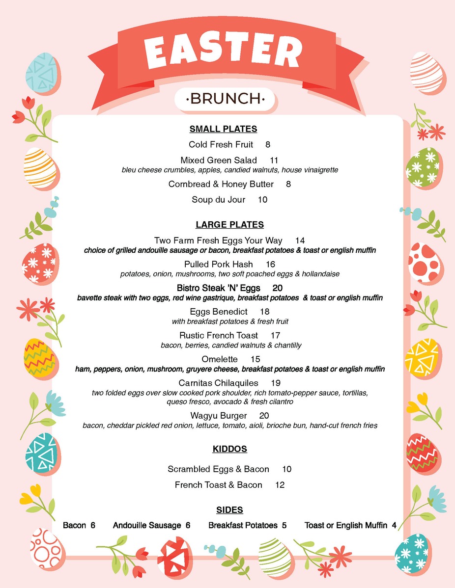 EventsEASTER BRUNCHSUNDAY, APRIL 5TH9:00am - 2:00pmAPRIL MUSIC SCHEDULEALL PERFORMANCES FROM 5:30 - 8:30